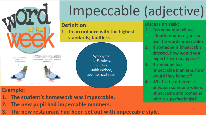 “Word of the Week” introduces students to a range of new vocabulary that can be used across all subjects. A robust vocabulary improves all areas of communication — listening, speaking, reading and writing. Vocabulary growth is directly related to school achievement.