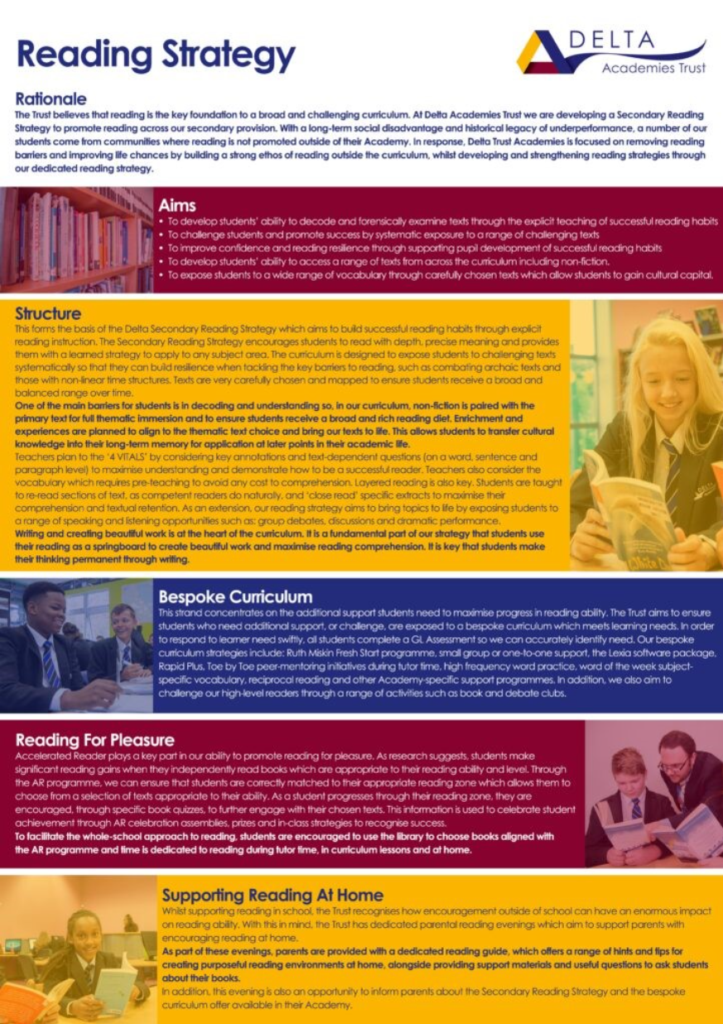 The English secondary reading strategy is delivered via English lessons, where all students are given access to a range of fiction and non-fiction texts. Students read and reread texts to find layers of meaning and increase understanding. Each text also focuses on a key theme to encourage our students’ personal development.