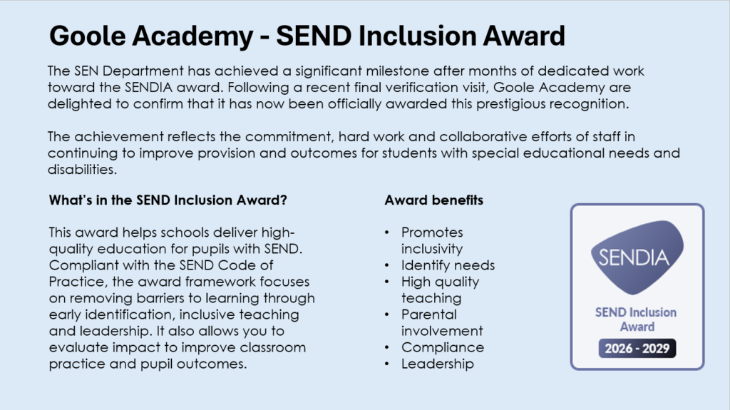 Goole Academy adopts a ‘whole school approach’ to Special Educational Needs and Disabilities. All staff strive to promote inclusion of all students. The School is committed to ensuring that pupils with special educational needs and disabilities can fulfil not only their academic potential and achieve optimal educational outcomes, but also achieve physically, creatively, emotionally and socially.